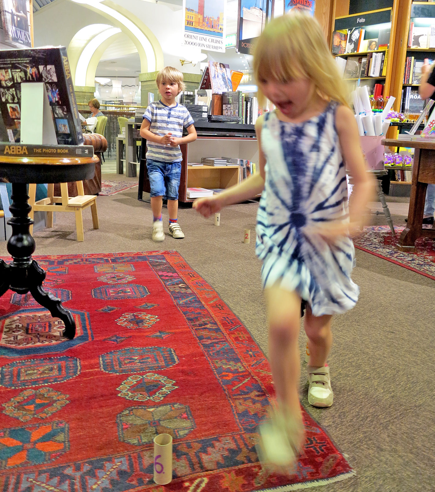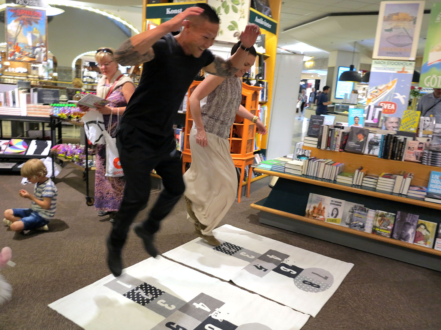 Vi lägger ut mattor för att hoppa hage och ställer ut numrerade toarullar att springa slalom mellan – precis en sådan bana som Dante har i boken. Junior och Jonna provspringer. Men banan blir lite väl lång med 10 rullar, runt hela bokhandeln nästan så att det stör övriga besökare i bokhandeln. Fick därför räcka med hagarna.