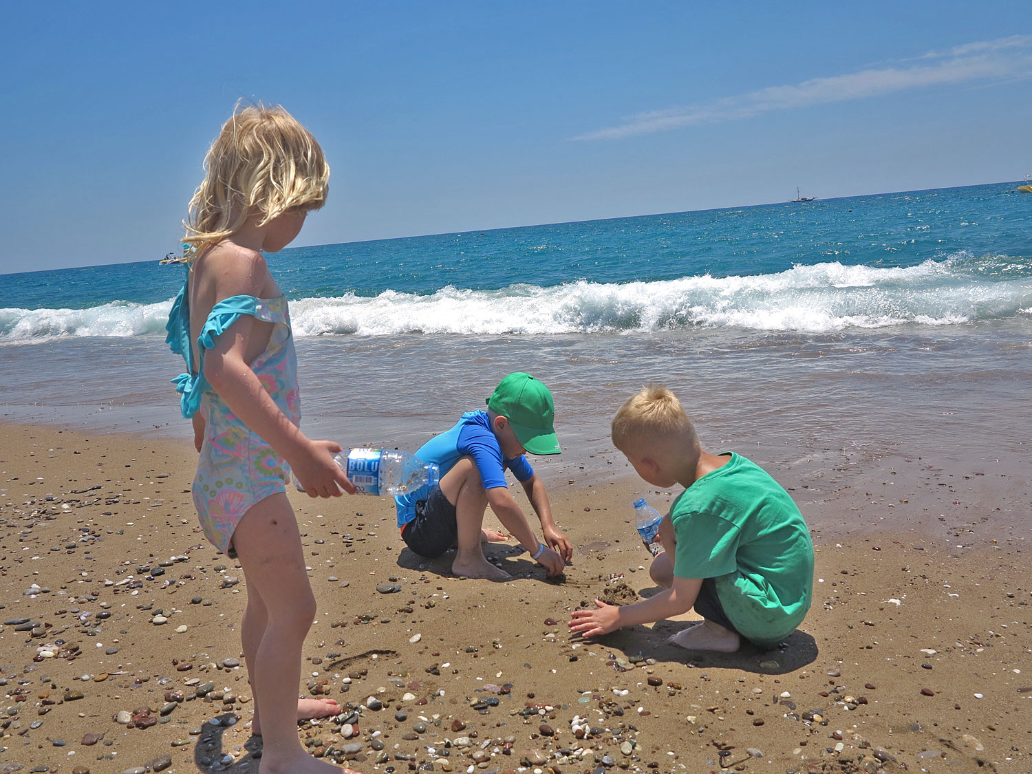 turkiet_beach_jj_alvarJonna och Junior har blivit så goda vänner med Millas son Alvar. Här bygger de sandslott och öser på vatten med tomma platsflaskor…