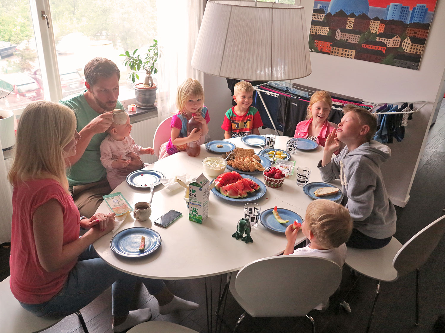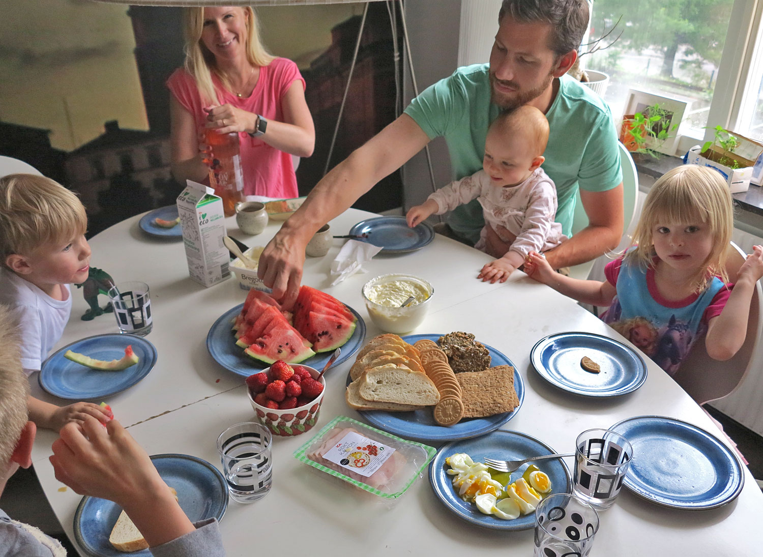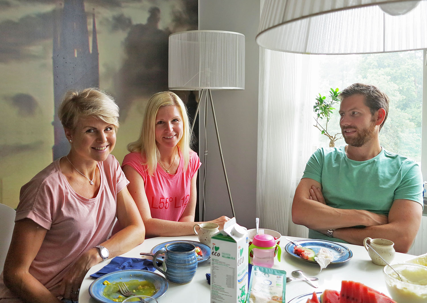Hampus var hos en kompis och Jonas jobbade, annars hela familjen Jonasson/Lindberg och Lissjanis samlade. Jag bjöd på typisk sommarfika, i alla fall för mig och min syster från vår uppväxt i Skåne. Fransbröd, melon, Brago-kex, jordgubbar och grädde bland annat.