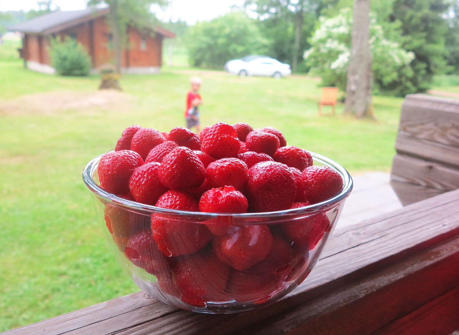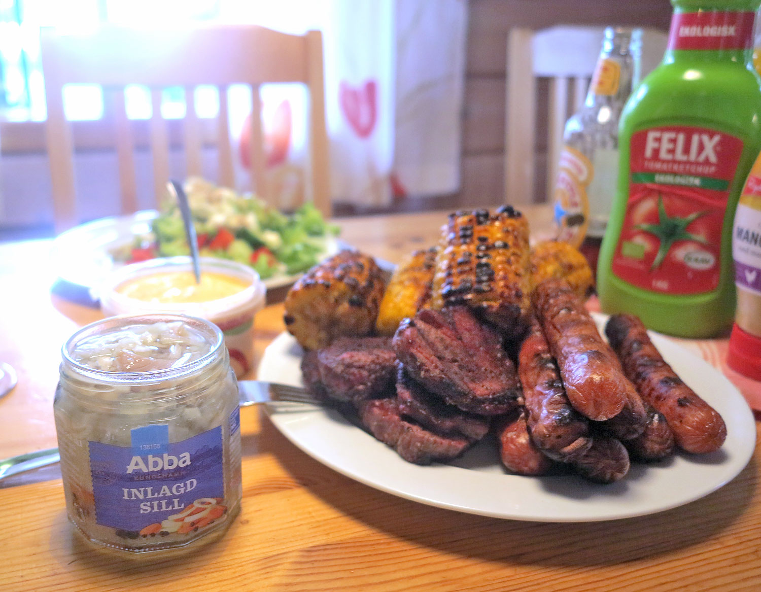 Den mest typsikt traditionella upplevelsen den här midsommaraftonen. Det blev inte ens någon sillunch, det jag annars berättade för dig var våran ”stående tradition”. Barnen sprang till grannarna och åt grillkorv, och vi vuxna orkade inte ordna till bara oss två. Vi tog en lätt lunch och åt lite tidigare middag istället. 3-rätters med sill och nypotatis, grillade majskolvar, korv och kött från trakten. Sen ännu mer jordgubbar, toppat med sommarens första dopp i havet för de mest modiga av oss.
