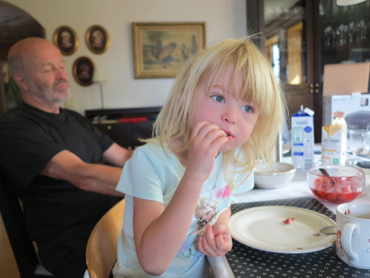 » Även idag äter vi frukost innan den långa bilfärden mot Stockholm, men igår med mer ro. Tror det är rekord hur länge vi suttit och pratat vid varje måltid den här sommaren, nu när alla barn dels är stora nog att delta en stund i samtalen och dels kan springa iväg och leka själva – utan vuxna som passar.