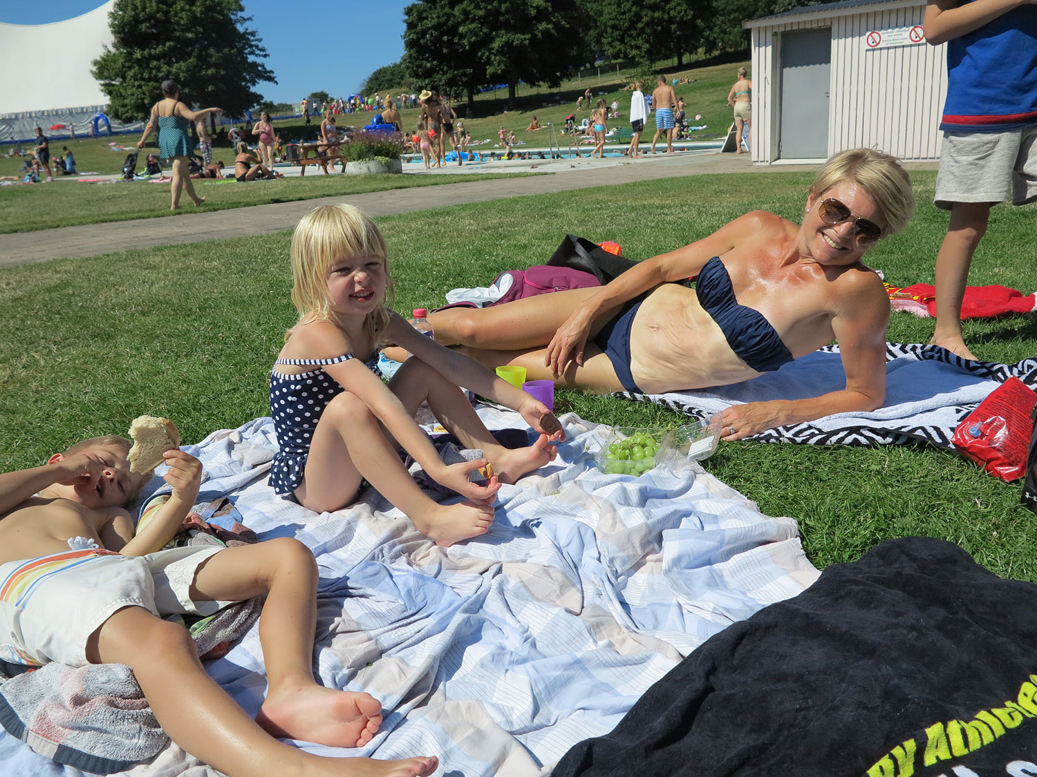 Efter chinsräcket blev det mer häng ute i solen. Jonas, jag och barnen gick till Kampementsbadet och köpte säsongskort till hela familjen. Det ligger bara ca 200 meter hemifrån och känns lite som vår egen pool och trädgård. Smidigt att gå till även när det inte är semester och även gymmet är bra om vi vill få variation till SATS. Jonas körde ett pass där och själv hoppade jag ner i bassängen så varmt det var. Ogillar pooler med högljudda, skvättande barn men vad gör man inte för barnen och att svalka sig var skönt. Jag övade på bentag med Junior och Jonna, slumrade sen till en stund på handduken när Jonas bytte av leken. Efter tre veckor har äntligen stressen lämnat kroppen och jag känner mig så avslappnad att jag t.o.m. kan sova en stund på dagen. Skönt och välbehövligt.