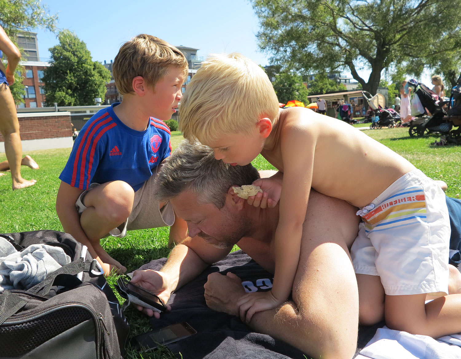 Vi var långt ifrån ensamma på Kampan. Massvis av Stockholmare var badsugna och det hängde även en hel del Pokémon´s i krokarna. Hela familjen var engagerad i Hampus jakt. Kul den där hypen tycker jag och bra med ett spel där barnen inte bara ska sitta still. Eller vuxna.