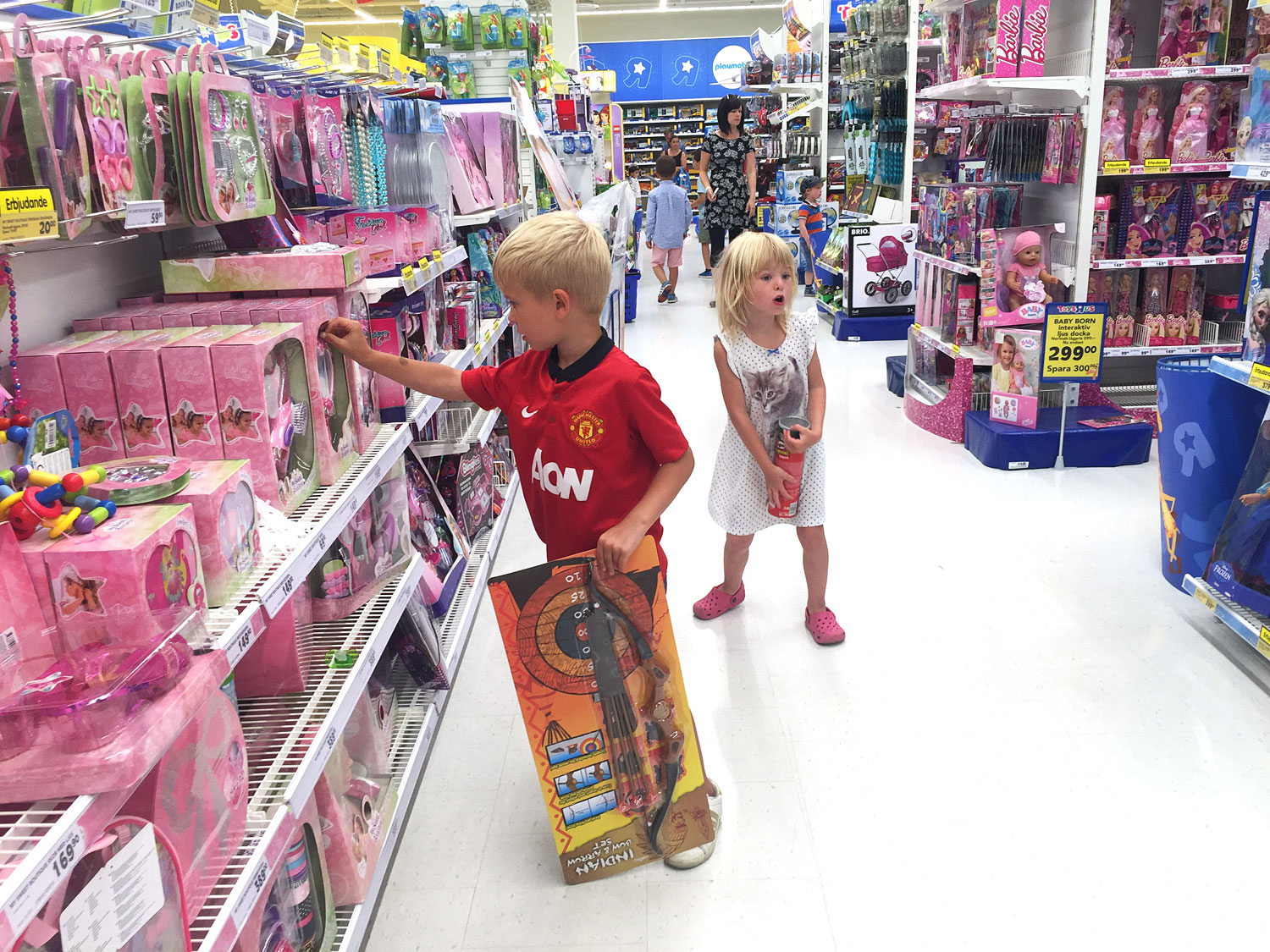 Men än så länge är de små lätta att få på andra tankar. Så Jonas såg Tarzan med storbarnen och jag gick på shoppingrunda i leksaksaffärerna istället. Det är dyrt med bio och att få välja varsin leksak istället var till och med snäppet bättre tyckte Junior och Jonna. Dessutom slapp de sitta still, något som bara brukar funka fram tills popcornen är uppätna.
