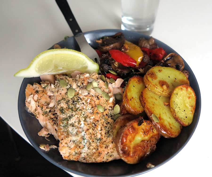Efter säkert en månad utan hade jag nästan glömt hur smidigt det är att laga middag i ugnen, men så kom vår beställda ugn i lördags som jag invigde ordentligt i söndags. Bakade både fröknäcke och gjorde en stor laddning lax & Co till middag. Allt på samma plåt, fisk såväl som grönsaker och potatis, för enkelhetsens skull.