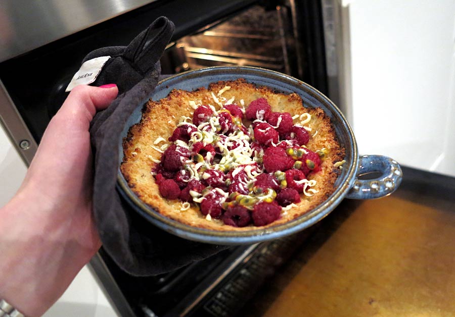 - Gratinera din hallonpaj i ugnen i 200° tills chokladen smält, ca 5-10 minuter.