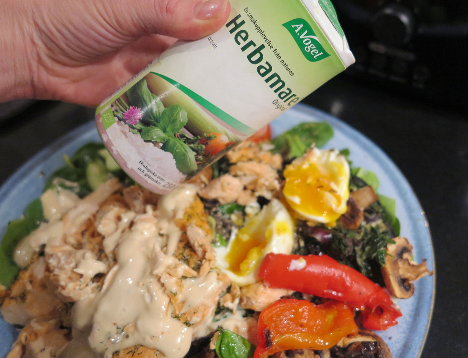 Örtsalt. En klassiker som passar på all typ av mat, här över ägg, lax och ugnsgrillade grönsaker.