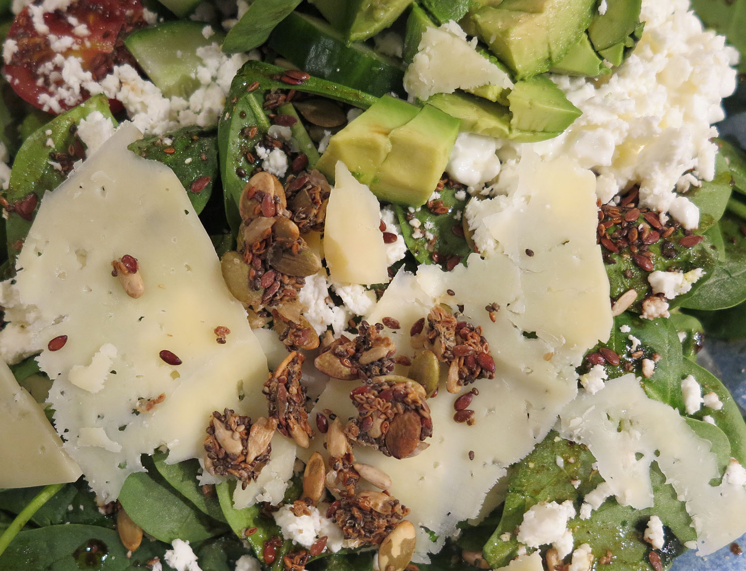 Ost. Gärna parmesan eller någon annan smakrik variant, fetaost, halloumi eller cottage cheese. Finemang som smakhöjare, för ökat kalcium- och proteininnehåll.