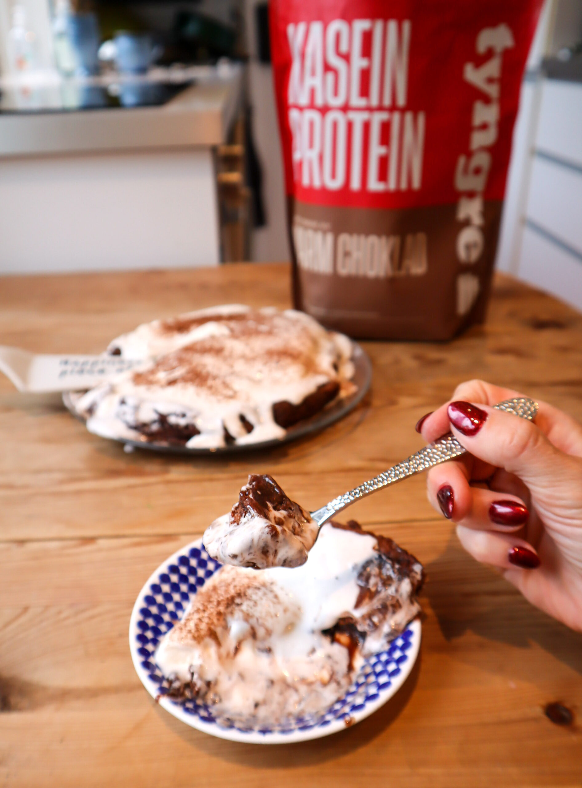 - 1 skopa (35 g) Tyngre Kasein Mjölkchoklad (alt. annat med chokladsmak)