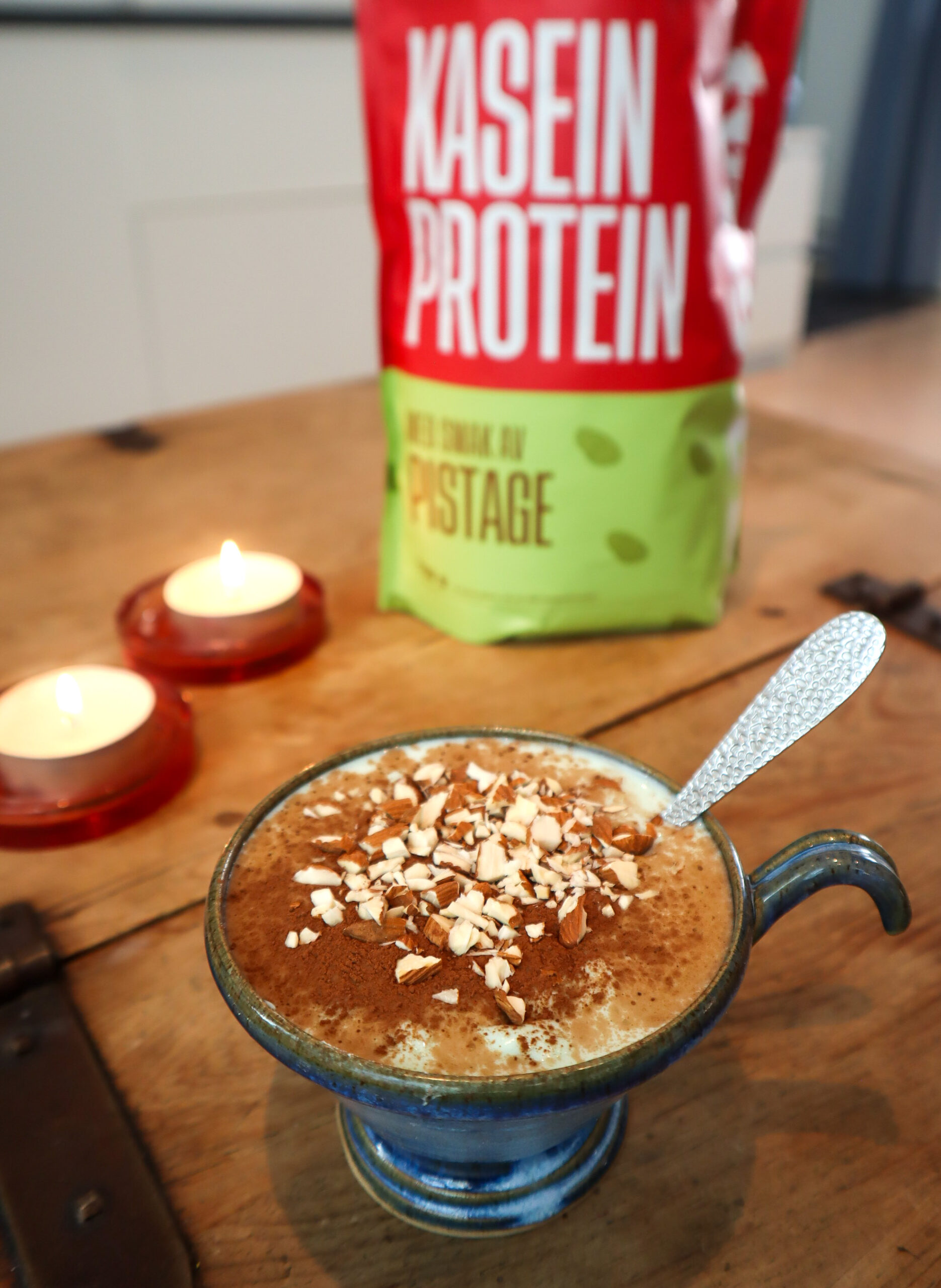 - 2 skopor (35 g x 2) Tyngre Kasein Pistage proteinpulver