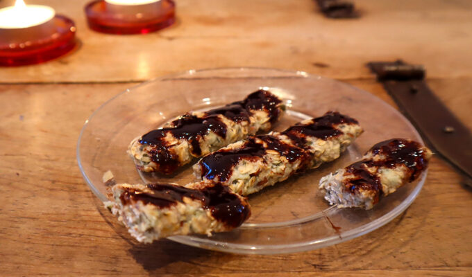 1. Rör ihop alla ingredienser utom jordgubbar och kakao till en kladdig smet. Blir den för hård – tillsätt mer vatten.