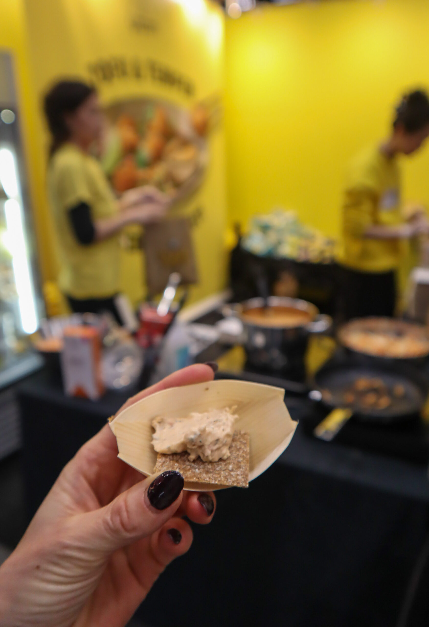 Små smakbitar av olika slag hör också hälsomässan till. Derins gulliga dotter blev extra förtjust i Yipins veganska snacks.