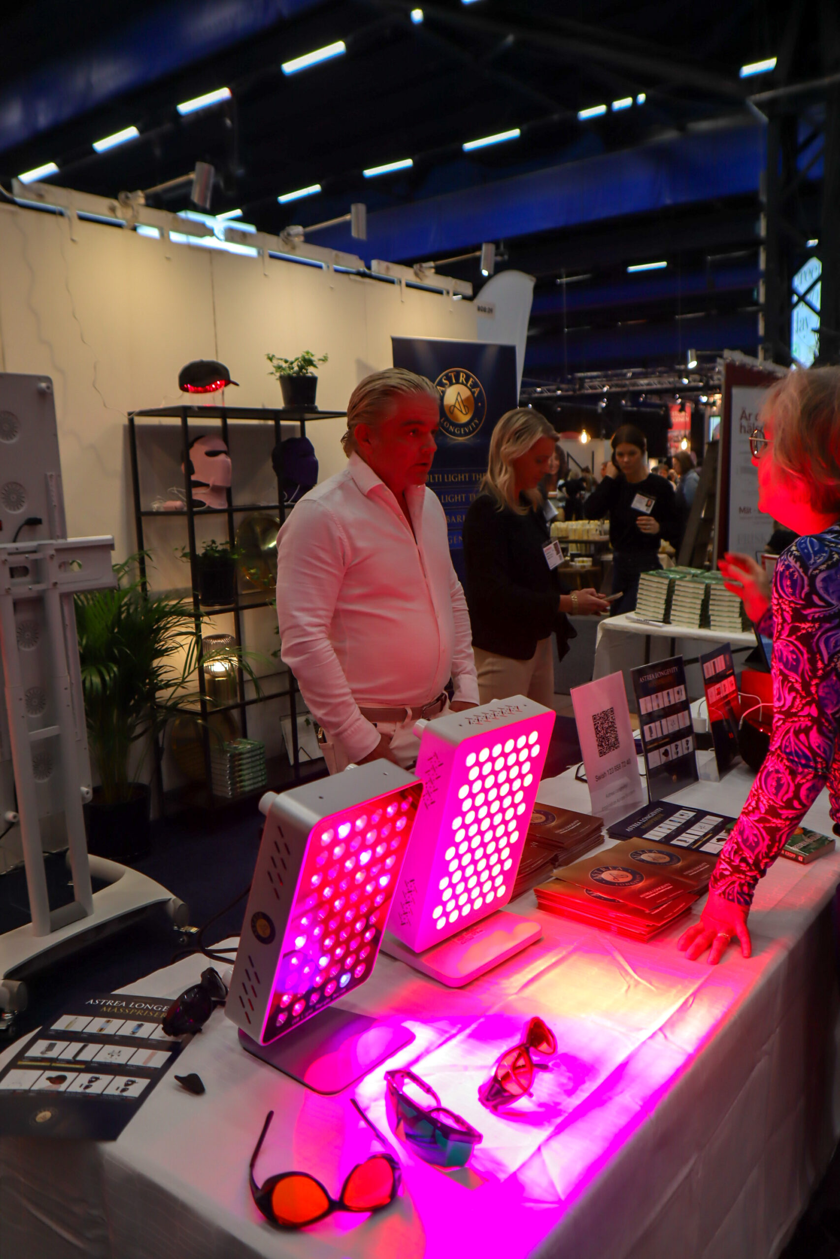 Jag fångad även några strålar rödljus och snack med Fredrik Paulún, ännu en stjärna du hör om longevity i poddavsnitt 76. På mässan visar Fredrik upp mycket av det han pratar om i podden, som vätevatten och nya, häftiga paneler som även gör dig brun. Det här ljuset är framtiden i varje hem, kontor etc. spår jag.