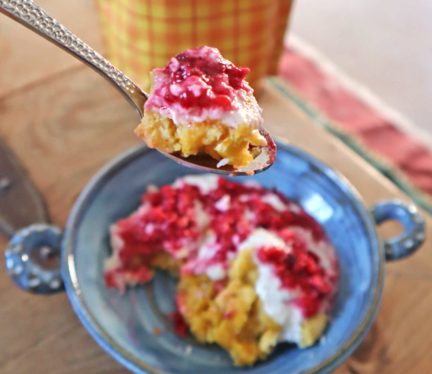 Proteinrik saffranskladdkaka med vitchokladkräm och hallon