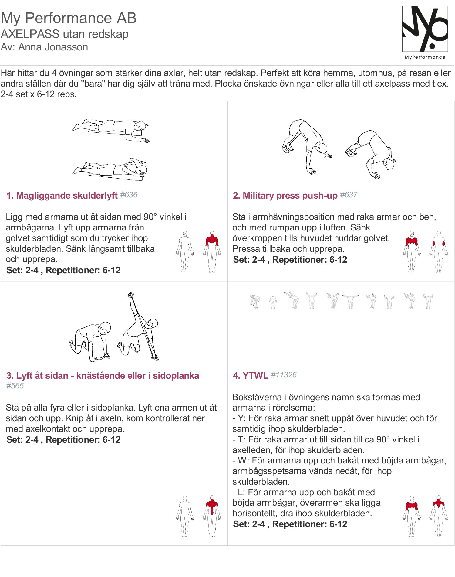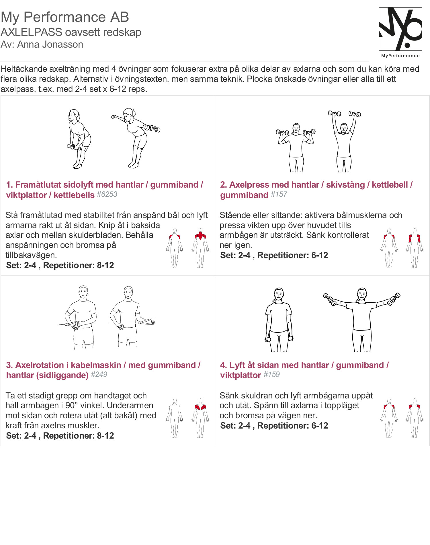 Välj ut 2-3 övningar åt gången att kompletter din övriga träning med eller kör alla som ett enskilt axelpass. Här ger jag förslag på att köra 2-4 set x 6-12 repetitioner per övning och sida, men även det anpassar du efter dig.