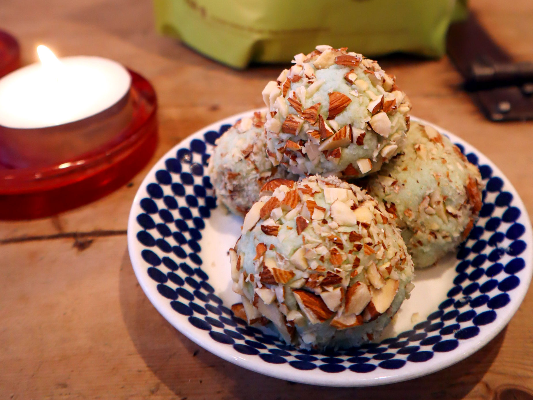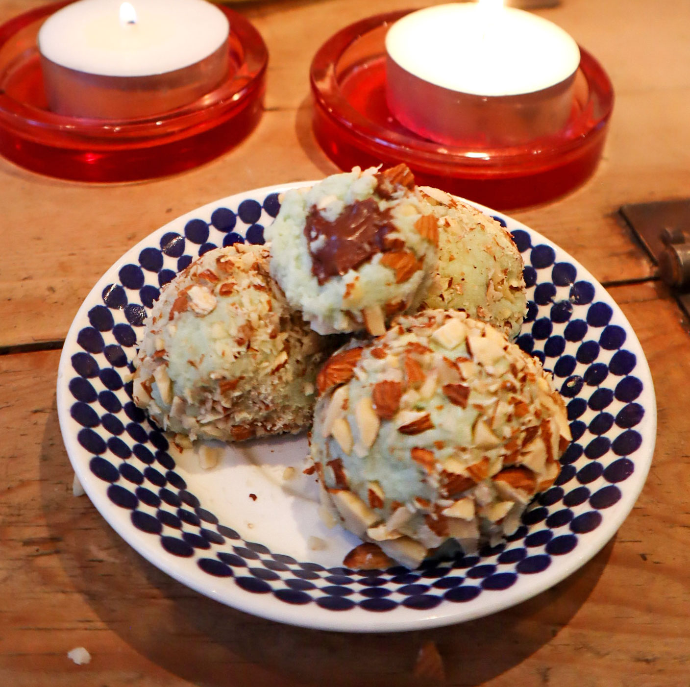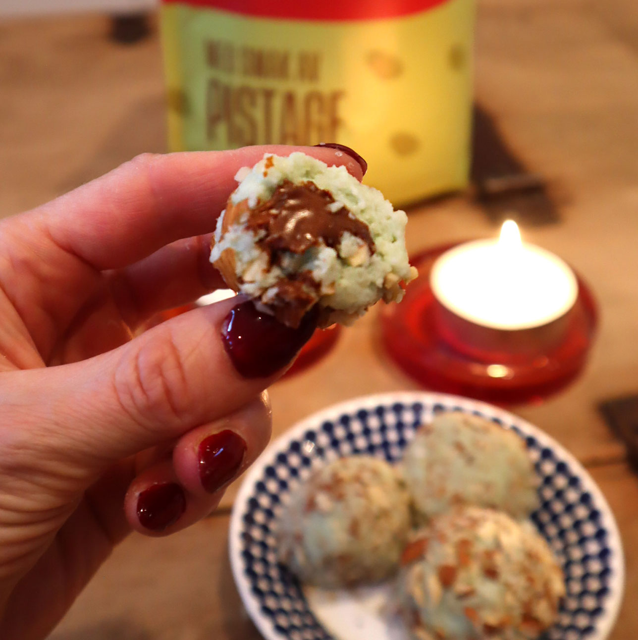 Om du tar en sådan här pistagvariant och doppar i smält choklad får du iallafall Dubaibollar som liknar den heta dubaichokladen smakmässigt. Eller julens klassiska mozartkulor toppade av mandel? Mycket goda oavsett namn om du frågar mig och nästan löjligt enkla att göra.