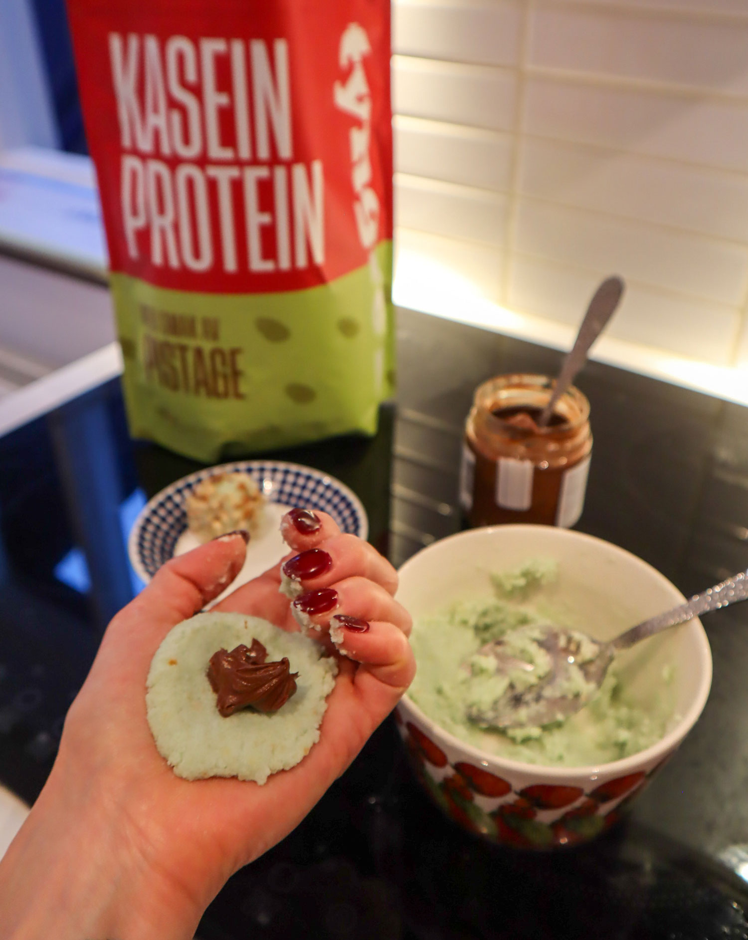 Vill du avancera kan du göra egen nutella, men nu ville jag ha något snabbt gott, så färdig från butiken fick duga. Annars är det bara ett fåtal ingredienser med pistageproteinpulver som bas.