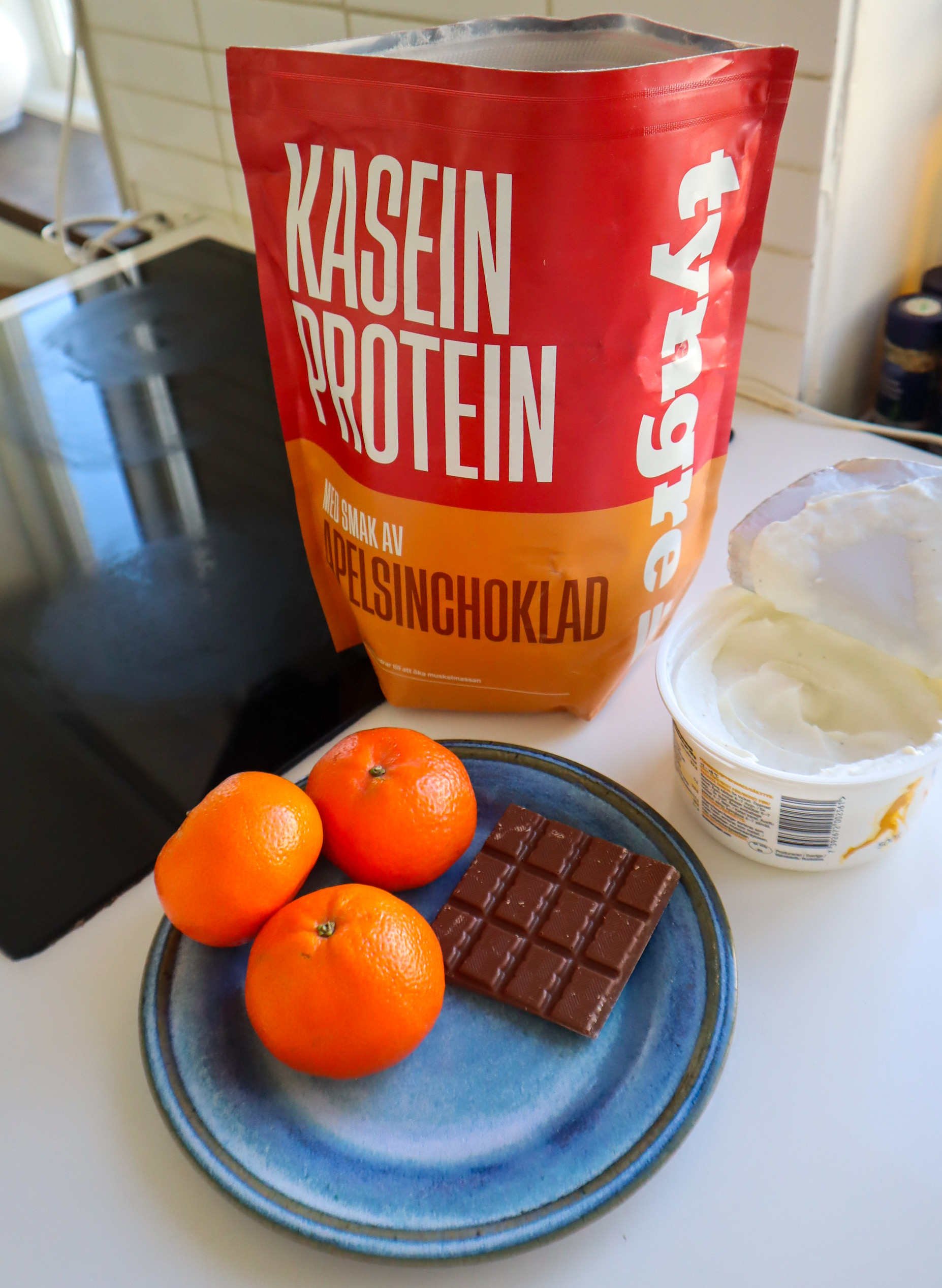 - 1 dl Kasein Apelsinchoklad (alt. annat med choklad- eller vaniljsmak)